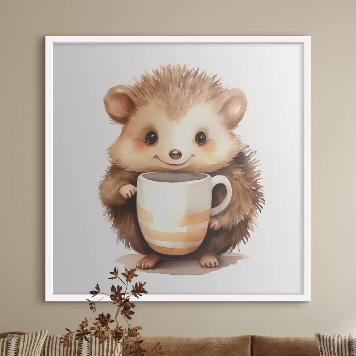 Постер на стіну Їжачок тримає в лапках білу чашку, акварельна ілюстрація для дітей Nr f39440