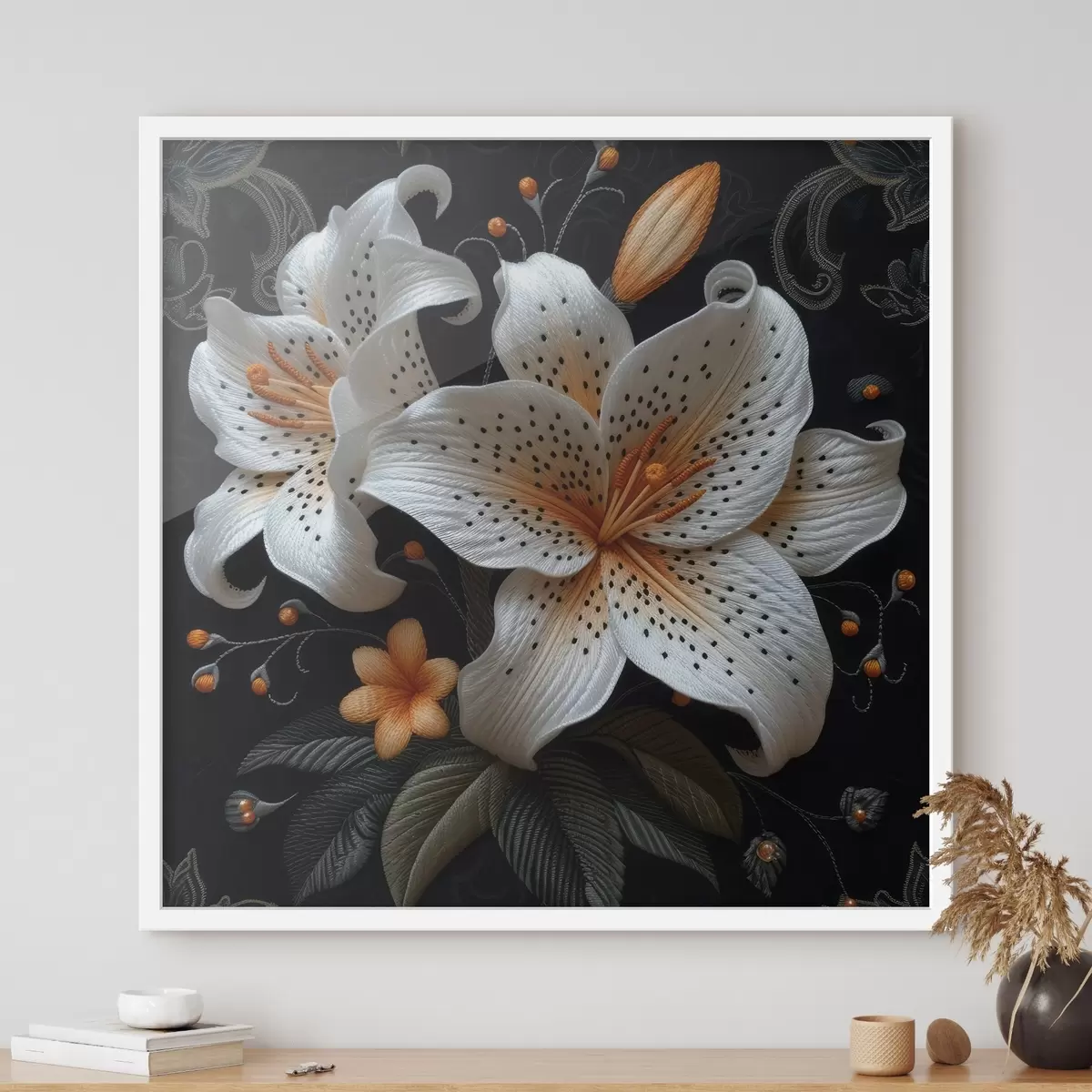 Постер на стіну Вишивка "пеньок": великі лілії, вишиті чорною ниткою на декоративній тканині зі складними деталями Nr f39655