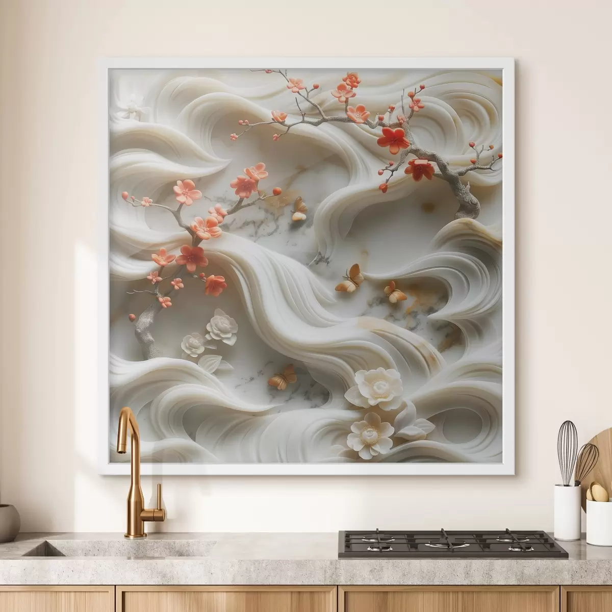 Постер на стіну Небесна 3D-сцена саду, вирізана з білого мармуру, з флорою та фауною Nr f39727