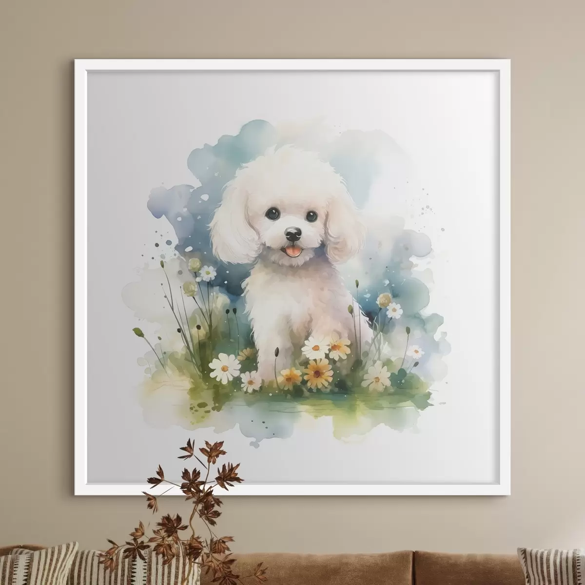 Постер на стіну Маленький білий пудель сидить на акварелі квітів Nr f39928