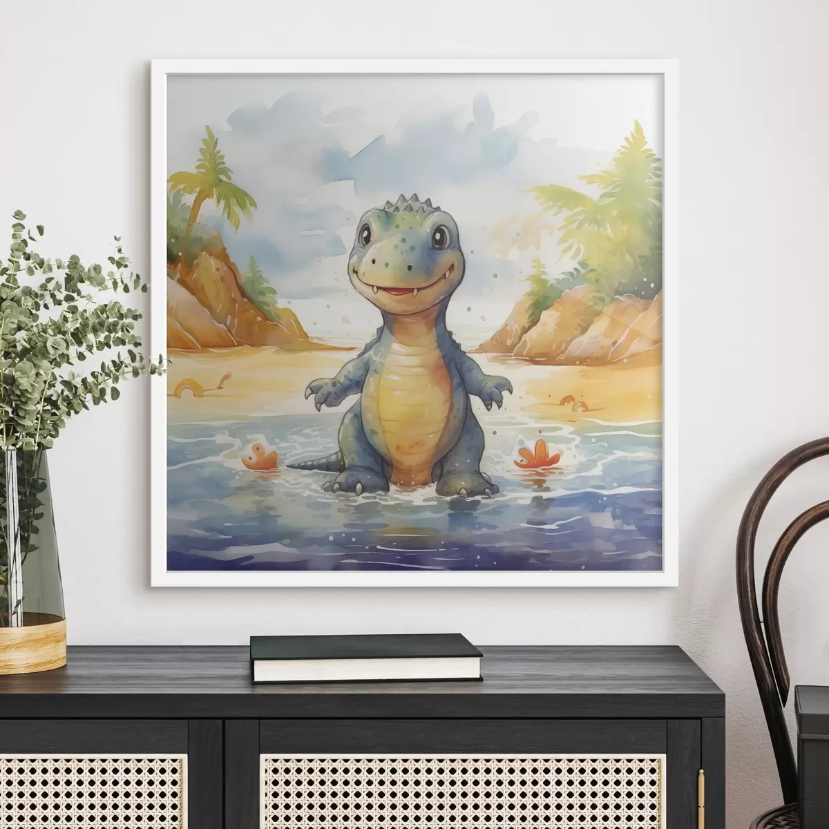 Постер на стіну Динозавр у річці на тлі гір і акварельних папоротей Nr f39930