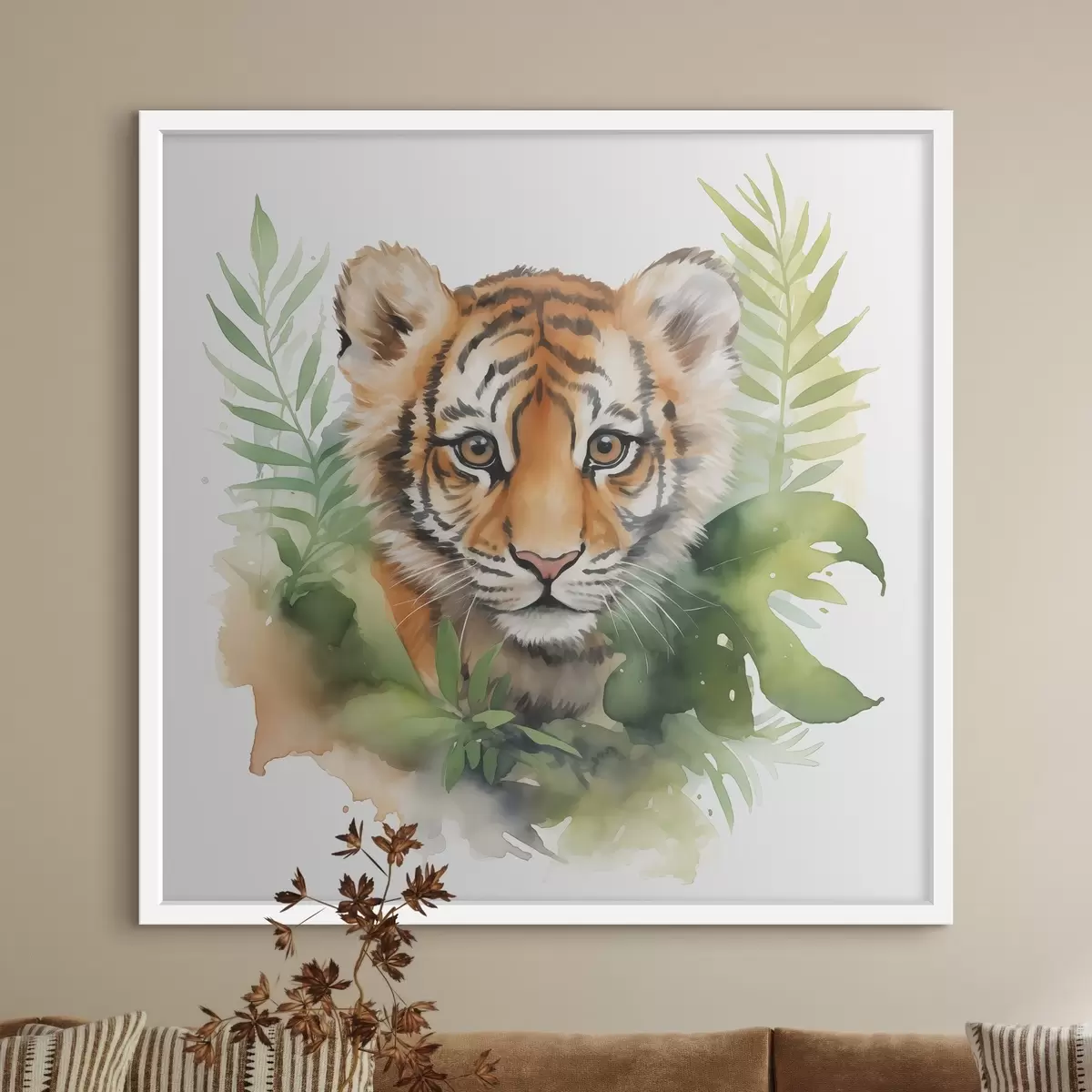 Постер на стіну Портрет тигра в акварелі з тропічним листям Nr f40090