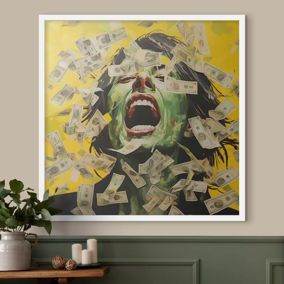 Постер на стіну Портрет зеленої жінки на жовтих, кричущих, паперових банкнотах, олійний живопис, що імітує гроші Nr f40096
