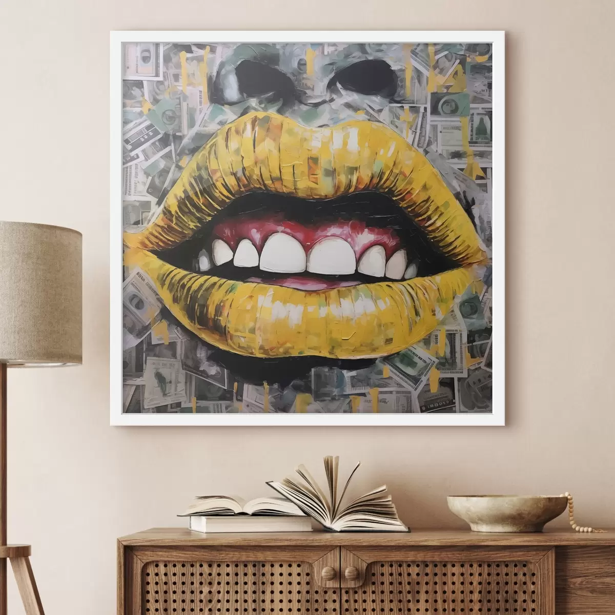 Постер на стіну Жовті губи, білі зуби, обличчя на банкнотах, що імітують олійний живопис Nr f40098
