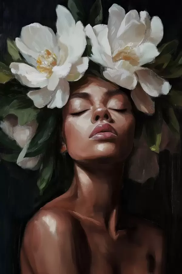 Постер на стіну Жіночий портрет з білими квітами у волоссі на темному тлі Nr f41824