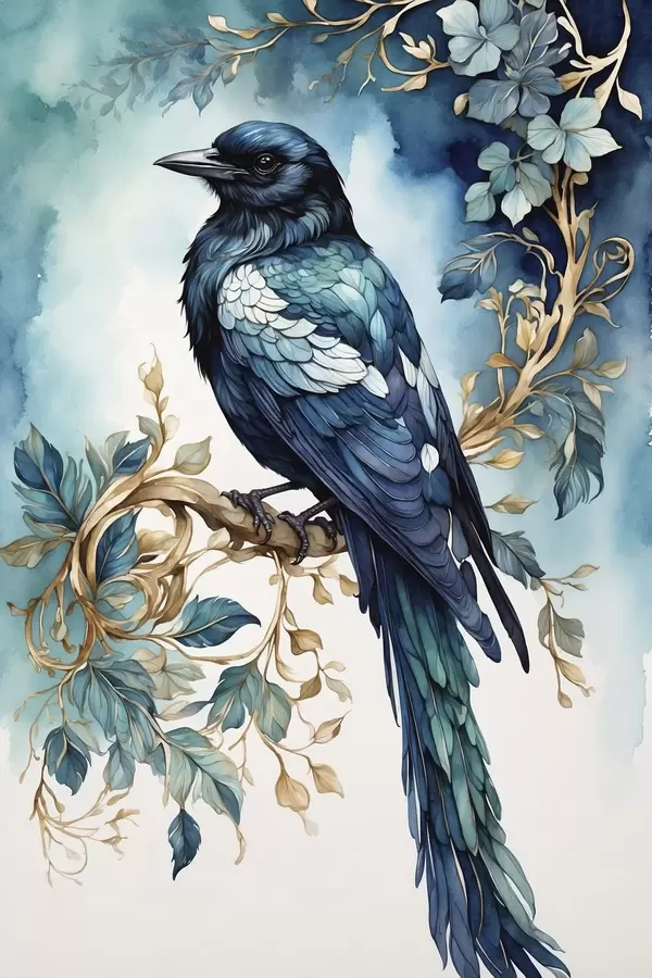 Постер на стіну Синій птах на гілці з акварельним листям Nr f45483