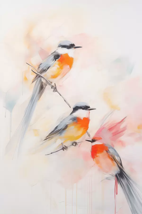 Постер на стіну Птахи на гілках, м'які пастельні кольори, світле тло з рожевими та білими відтінками Nr f45577