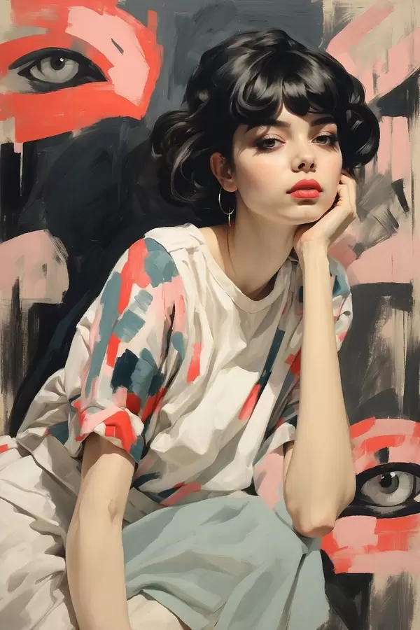 Постер на стіну Портрет дівчини на тлі з очима та абстрактними мазками Nr f45623