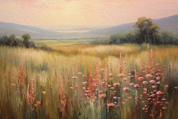Постер на стіну Польовий пейзаж з квітами на заході сонця Nr f45818