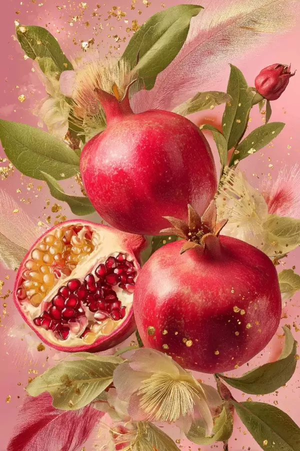 Постер на стіну Стиглі гранати на рожевому тлі з листям і золотистими цятками Nr f45868