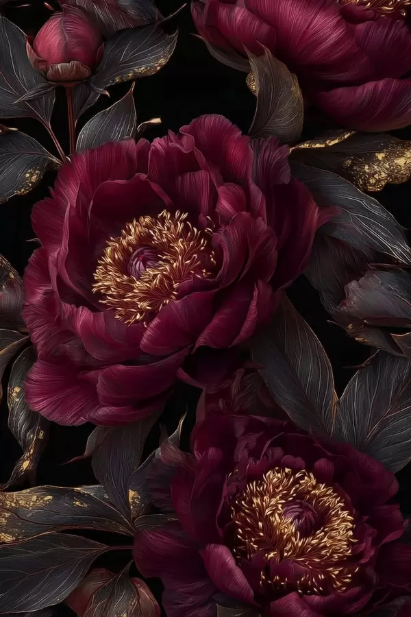 Постер на стіну Бургундські півонії на чорному тлі з жовтими акцентами Nr f45877