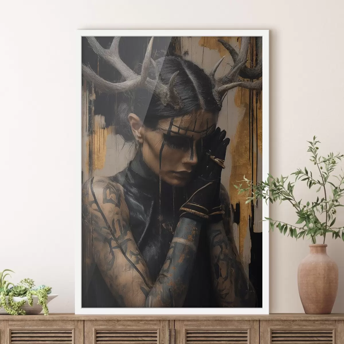 Постер на стіну Жінка з рогами в темному образі з чорними лініями на обличчі Nr f46144
