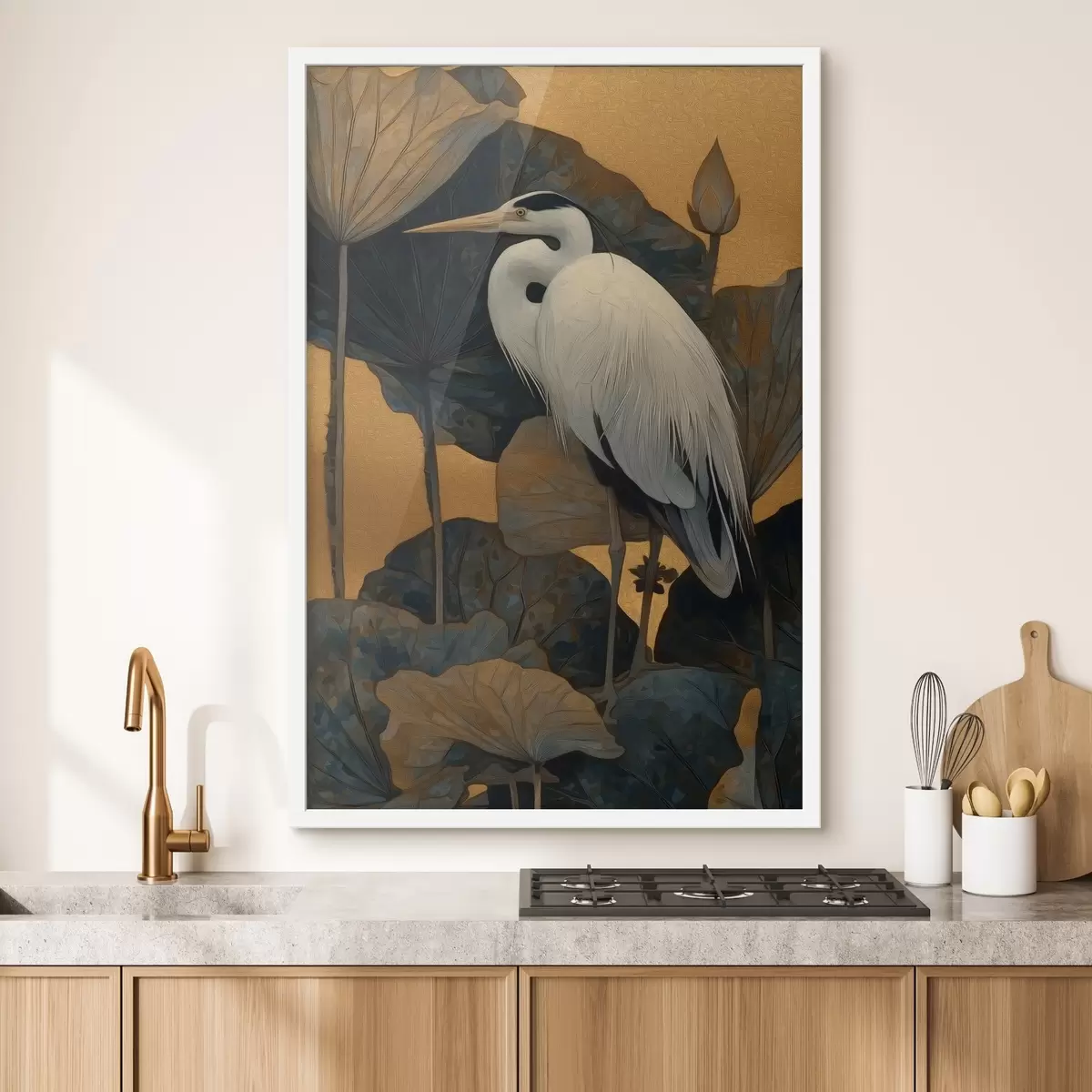 Постер на стіну Біла чапля серед великих листя на теплому тлі Nr f46147