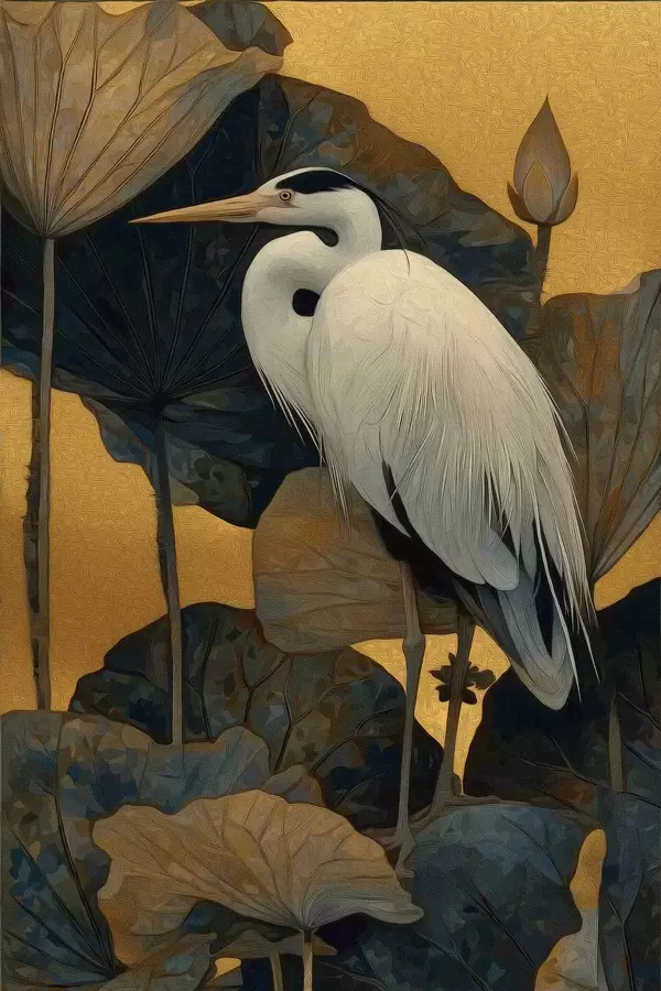 Постер на стіну Біла чапля серед великих листя на теплому тлі Nr f46147