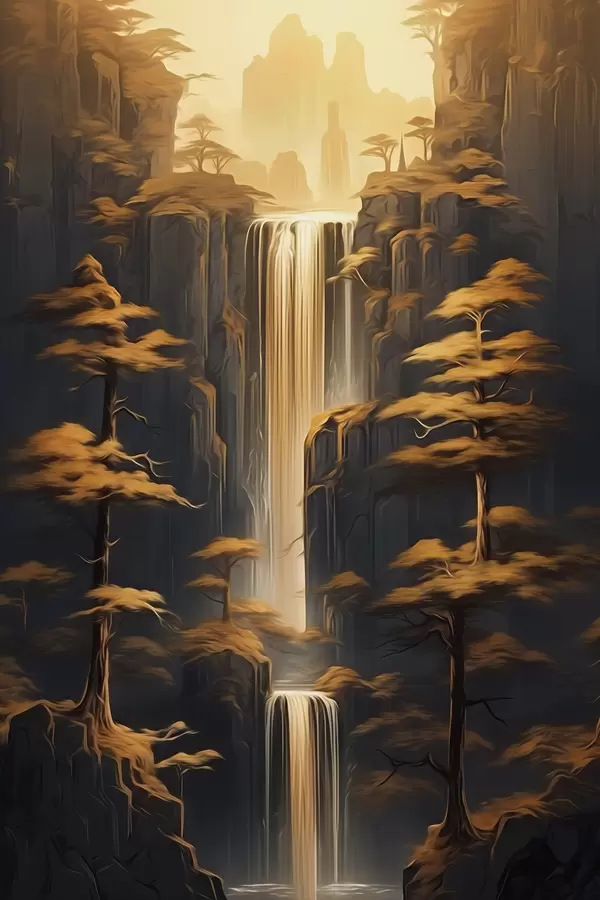 Постер на стіну Високі скелі з водоспадом і соснами у вечірньому світлі Nr f46151