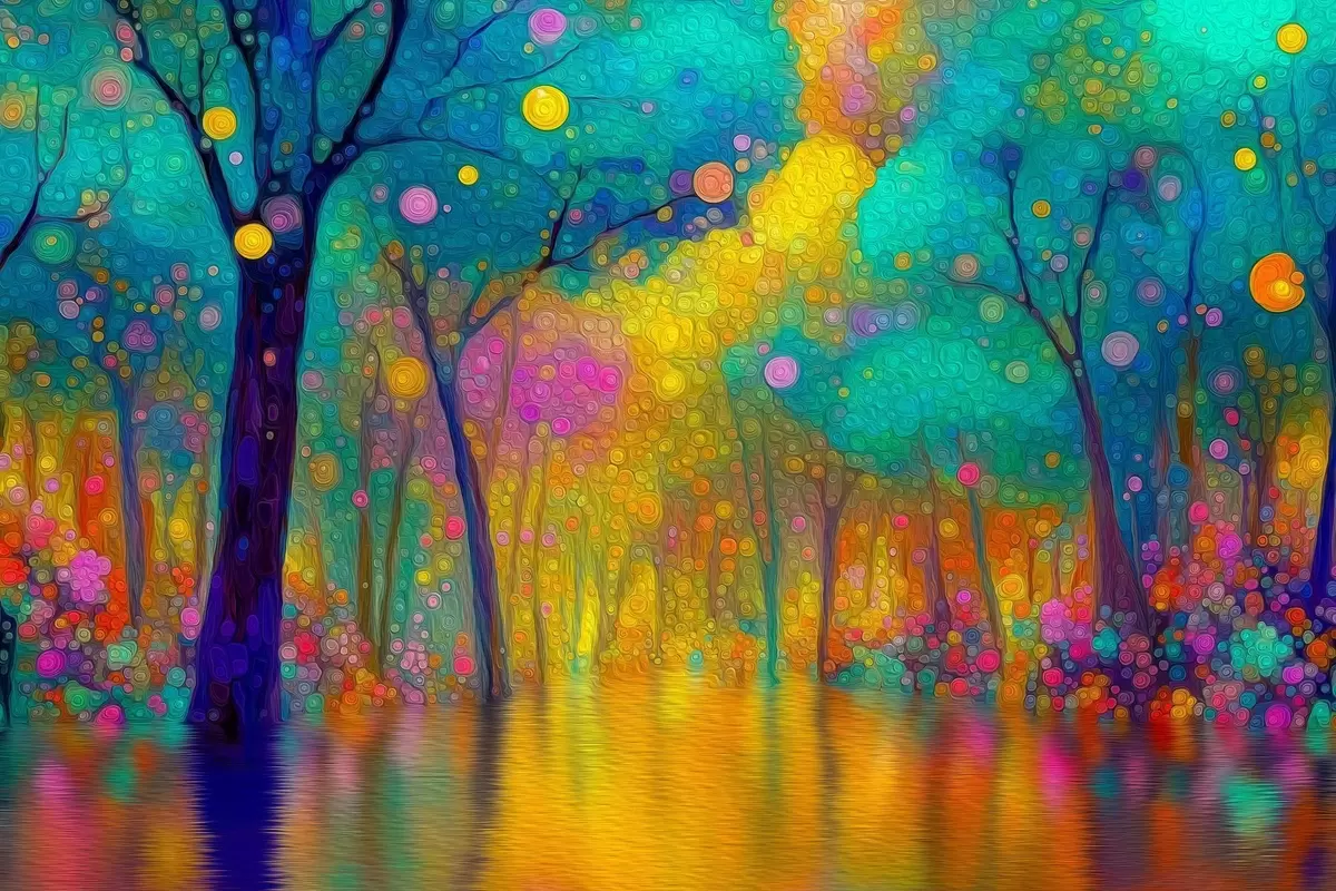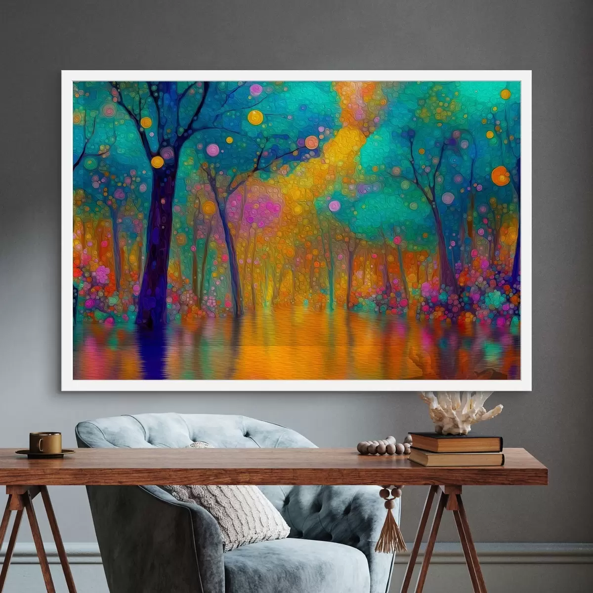 Постер на стіну Яскравий фантастичний ліс з відблисками у воді Nr f46171