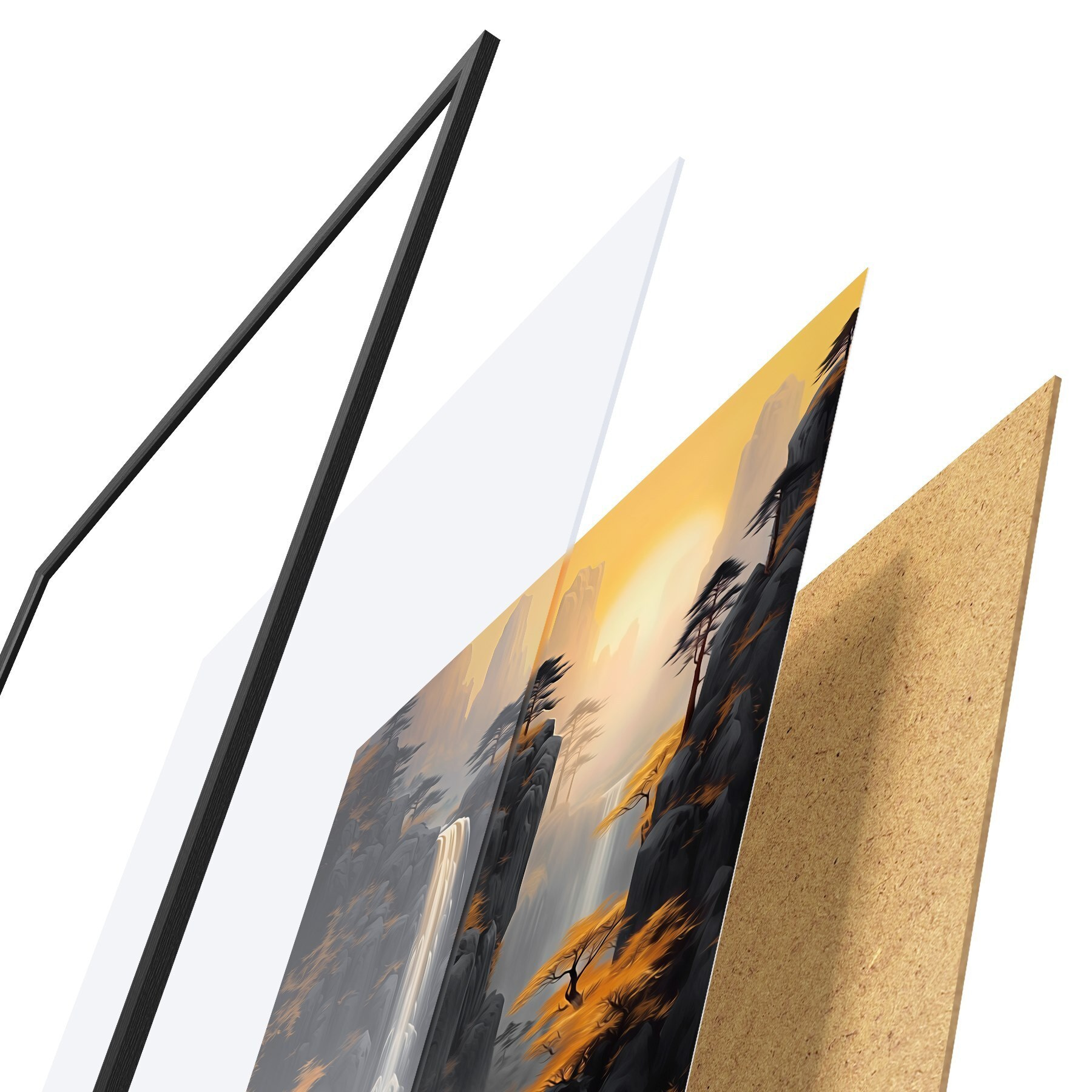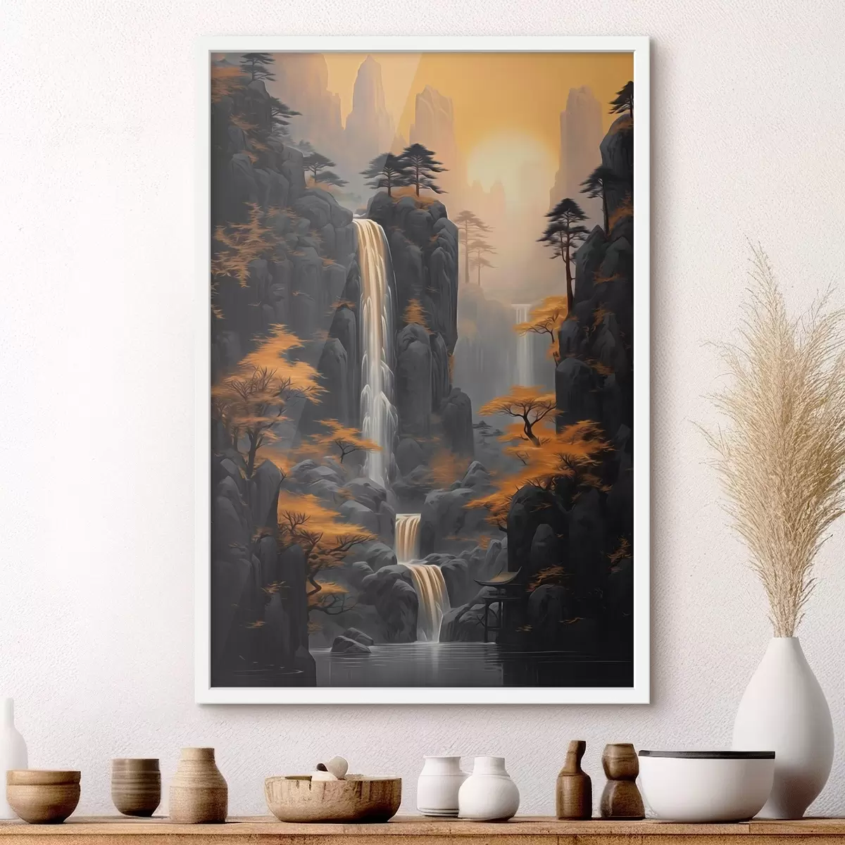 Постер на стіну Скелястий ландшафт з водоспадом у теплих тонах заходу сонця Nr f46177