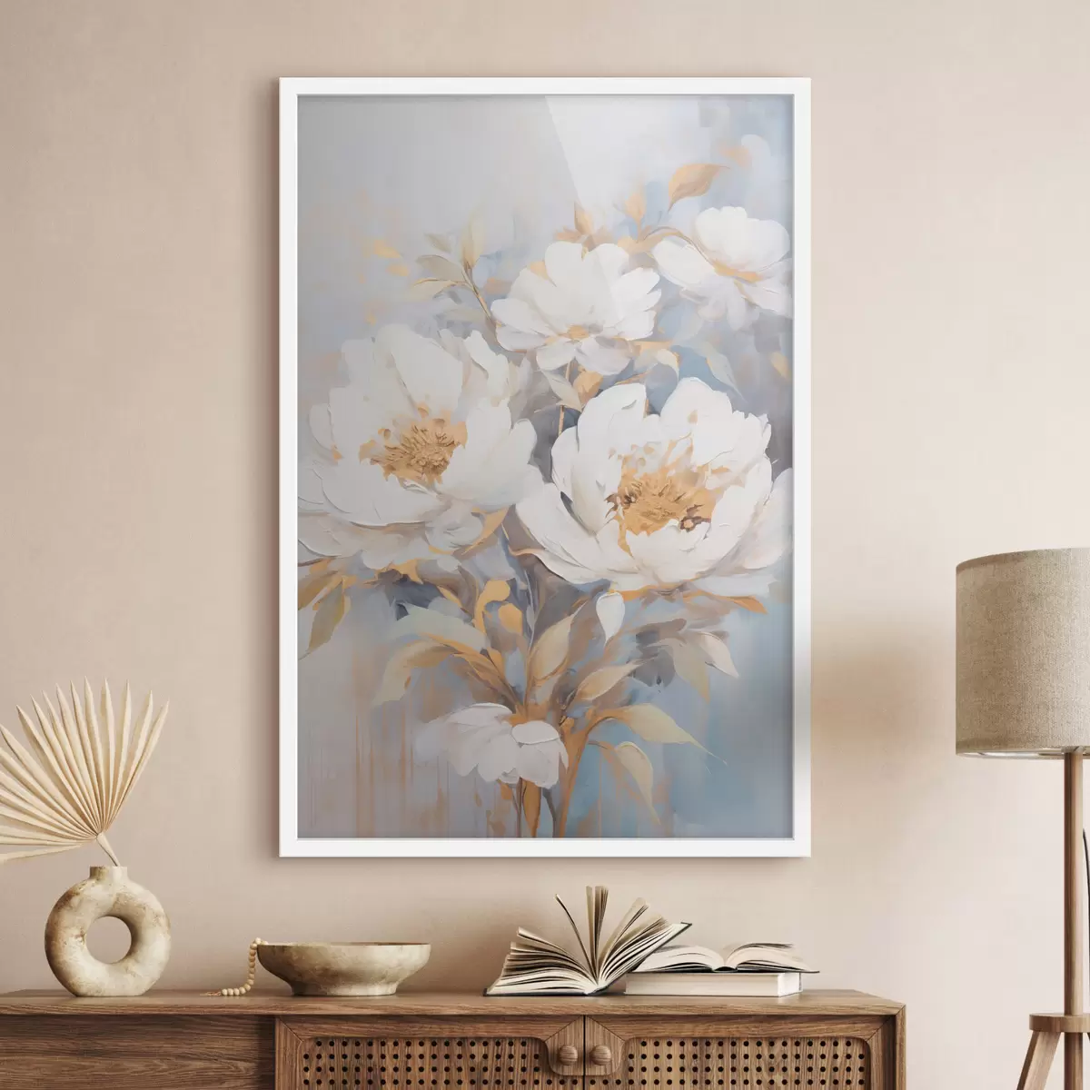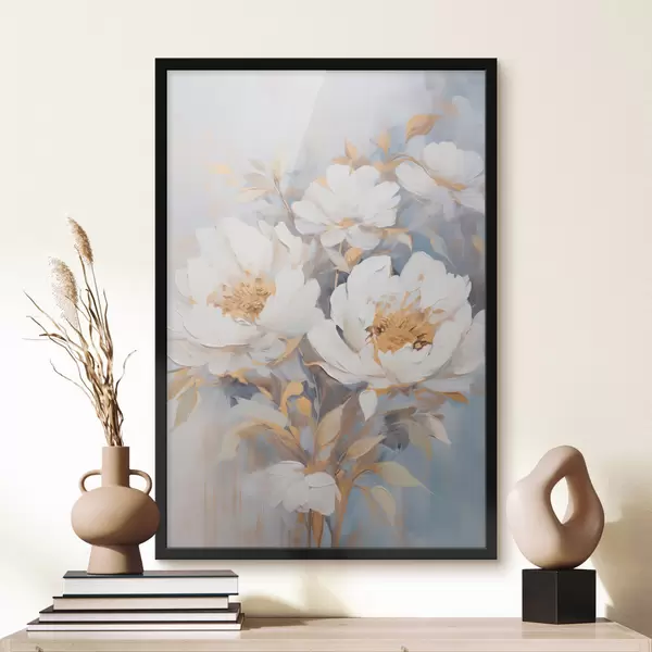 Постер на стіну Білі півонії з блакитними серединками і листям, м'які мазки, світло-блакитний фон, квіткова композиція Nr f46270