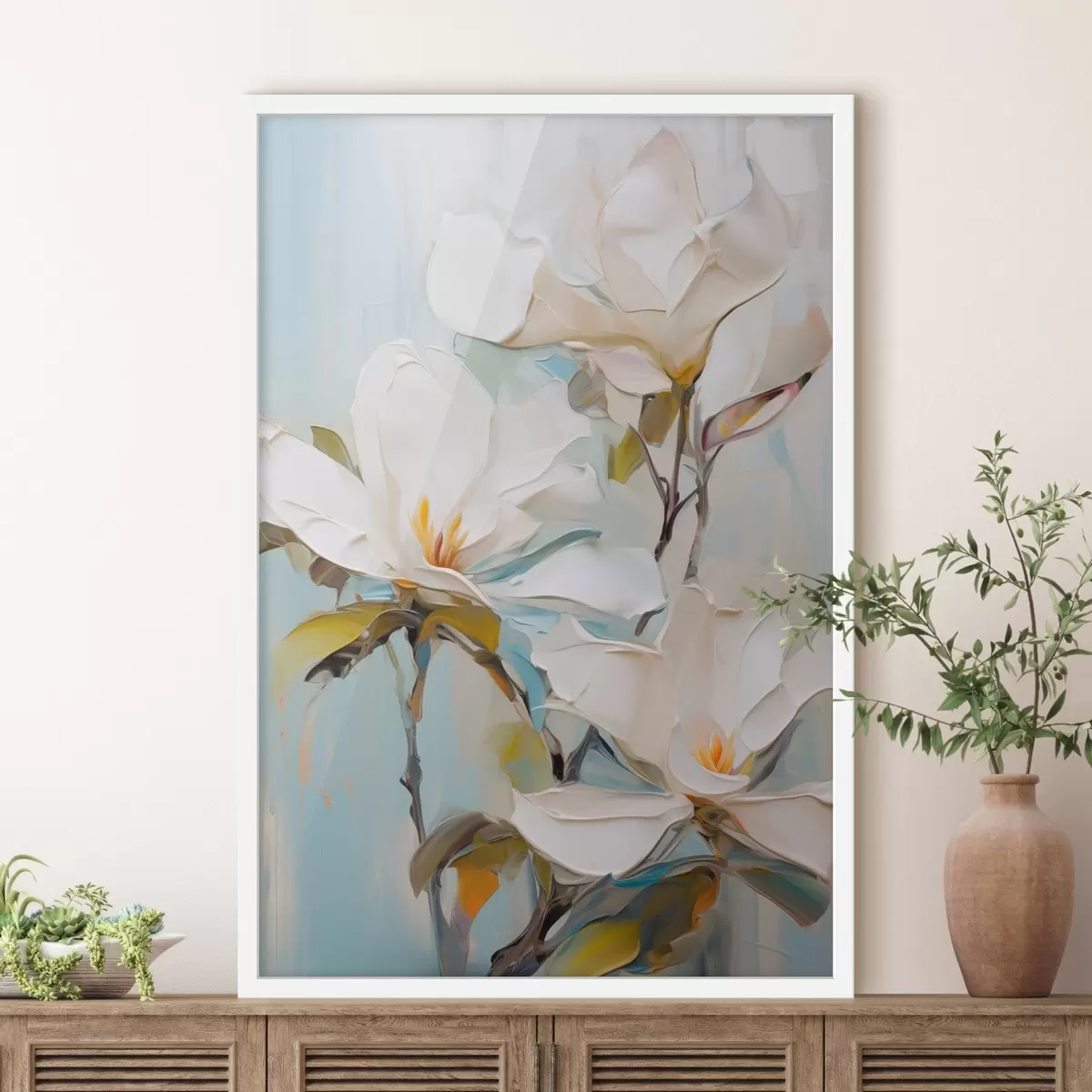 Постер на стіну Білі квіти магнолії, світло-блакитний фон з м'якими мазками пензля, стиль олійного живопису, імпасто-текстура Nr f46276