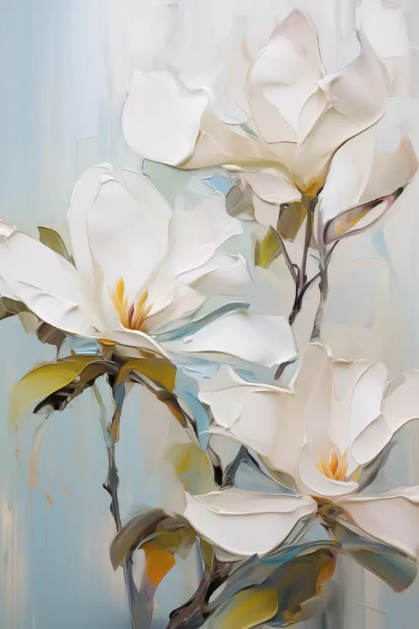 Постер на стіну Білі квіти магнолії, світло-блакитний фон з м'якими мазками пензля, стиль олійного живопису, імпасто-текстура Nr f46276