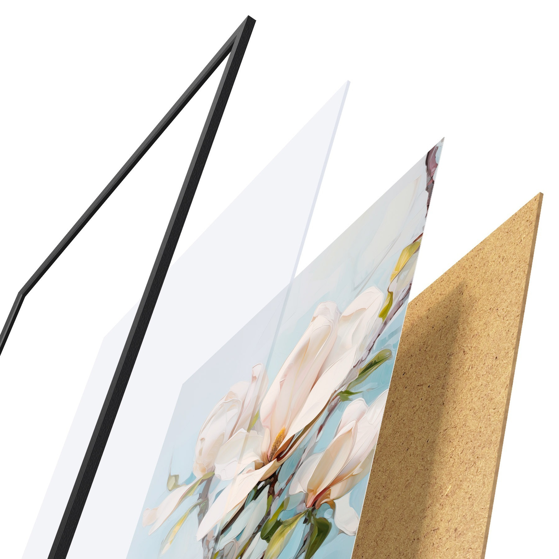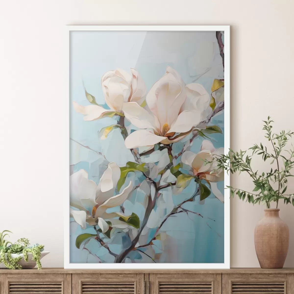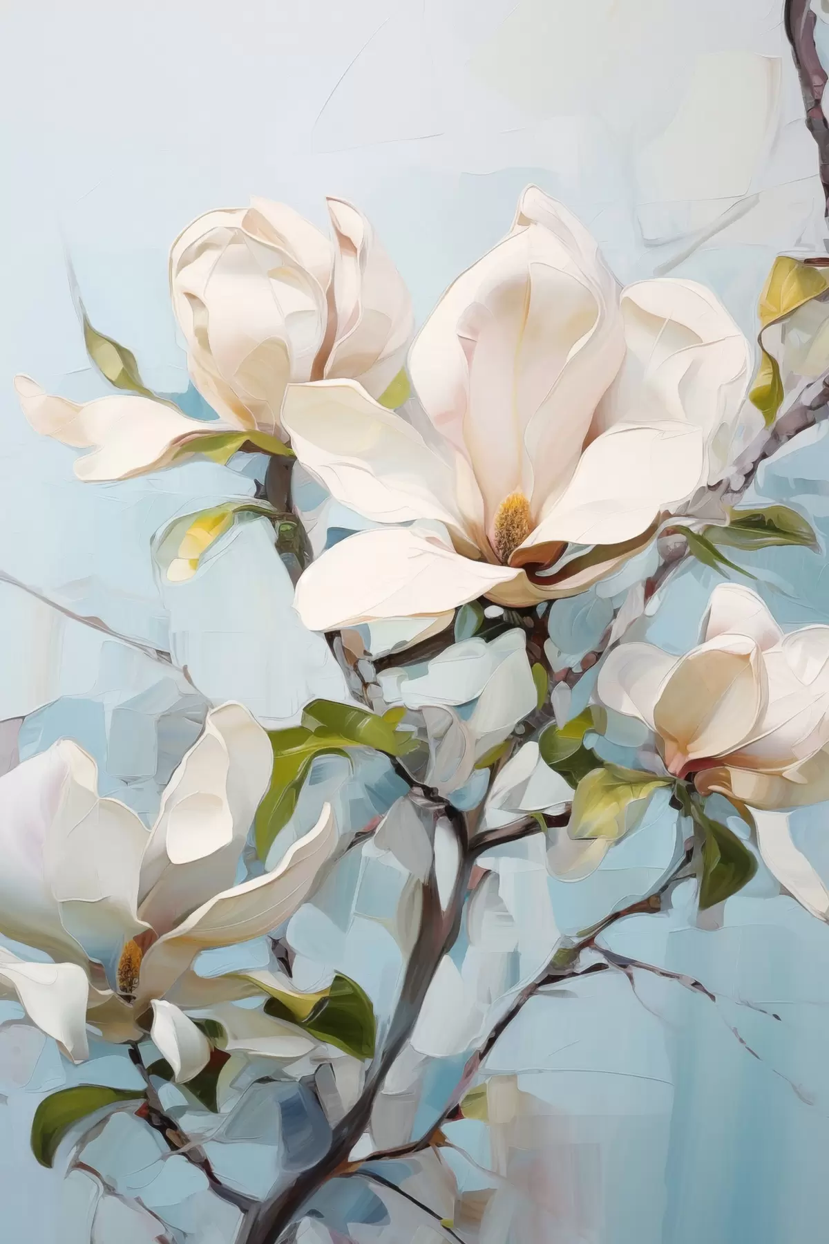 Постер на стіну Білі квіти магнолії, світло-блакитний фон з м'якими мазками пензля, стиль олійного живопису, імпасто-текстура Nr f46277