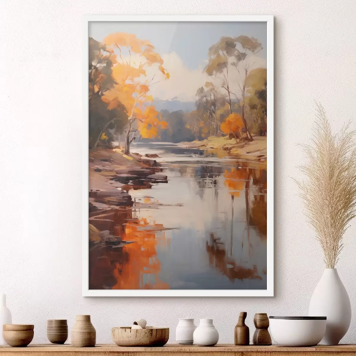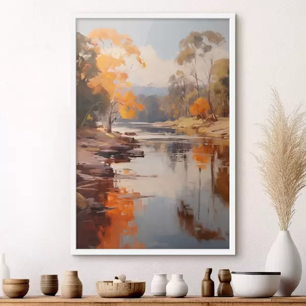 Постер на стіну Осінній пейзаж, річка з деревами на березі, ліс на задньому плані, відблиски на воді Nr f46280