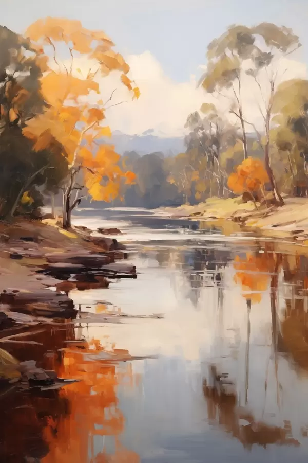 Постер на стіну Осінній пейзаж, річка з деревами на березі, ліс на задньому плані, відблиски на воді Nr f46280