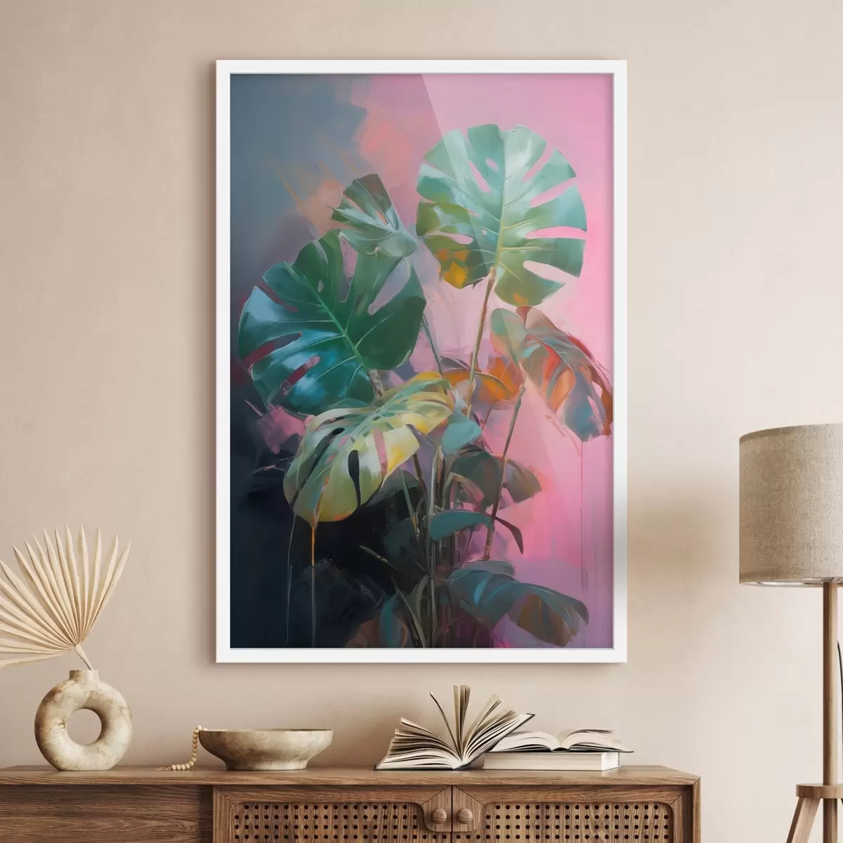 Постер на стіну Абстрактна рослина монстера з яскраво-зеленим листям на тлі ніжних рожевих і фіолетових відтінків Nr f46286