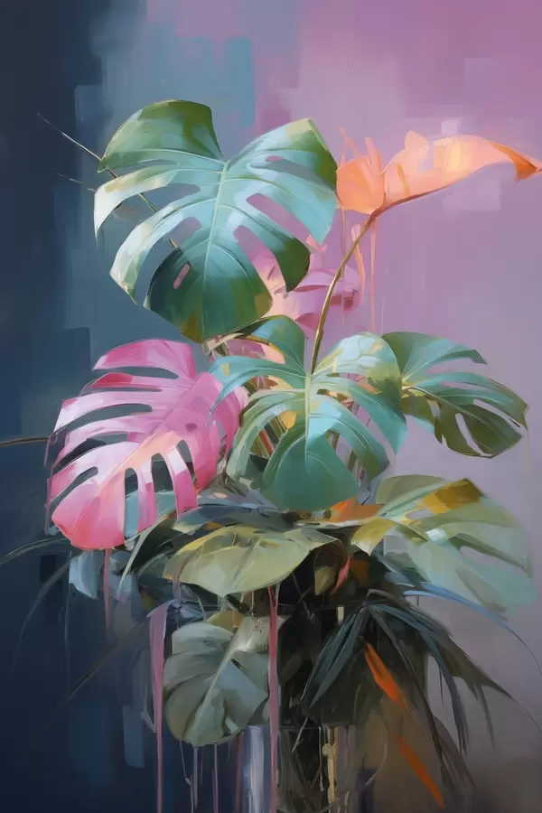 Постер на стіну Абстрактна рослина монстера з рожевими та зеленими листям, яскравими кольорами, на розмитому тлі Nr f46287