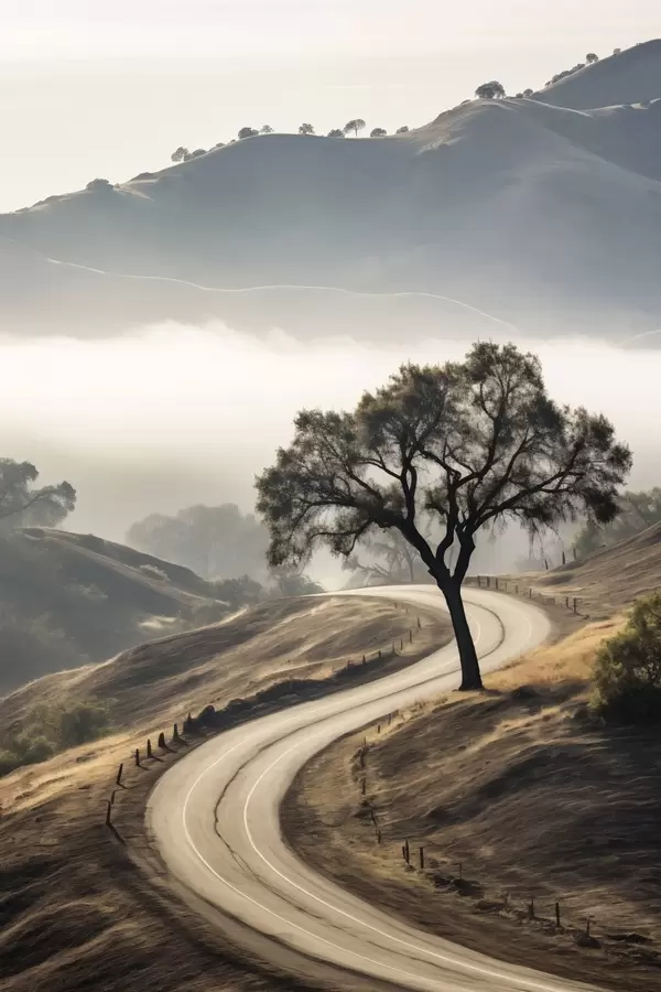Постер на стіну Звивиста дорога через пагорби з деревом на передньому плані, на задньому плані туман і гори Nr f46288