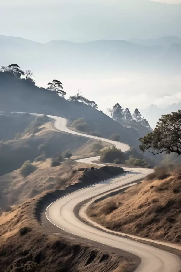 Постер на стіну Звивиста дорога через горбистий ландшафт з сухою травою під чистим небом, а вдалині видніються гори Nr f46289