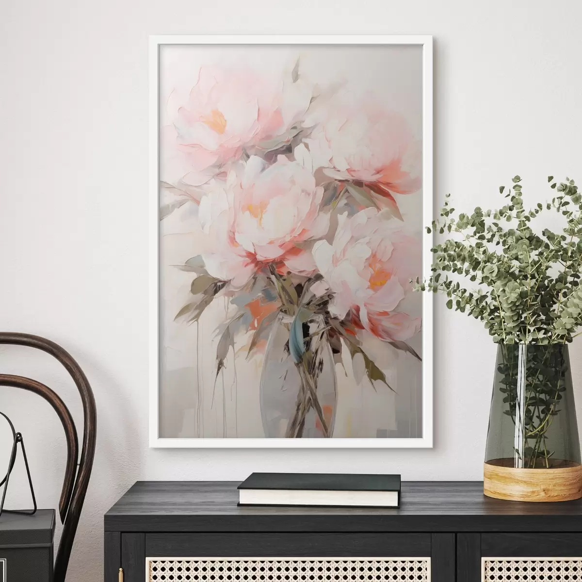 Постер на стіну Букет рожевих і білих півоній у скляній вазі, м'які мазки, пастельні кольори, нейтральний фон Nr f46295