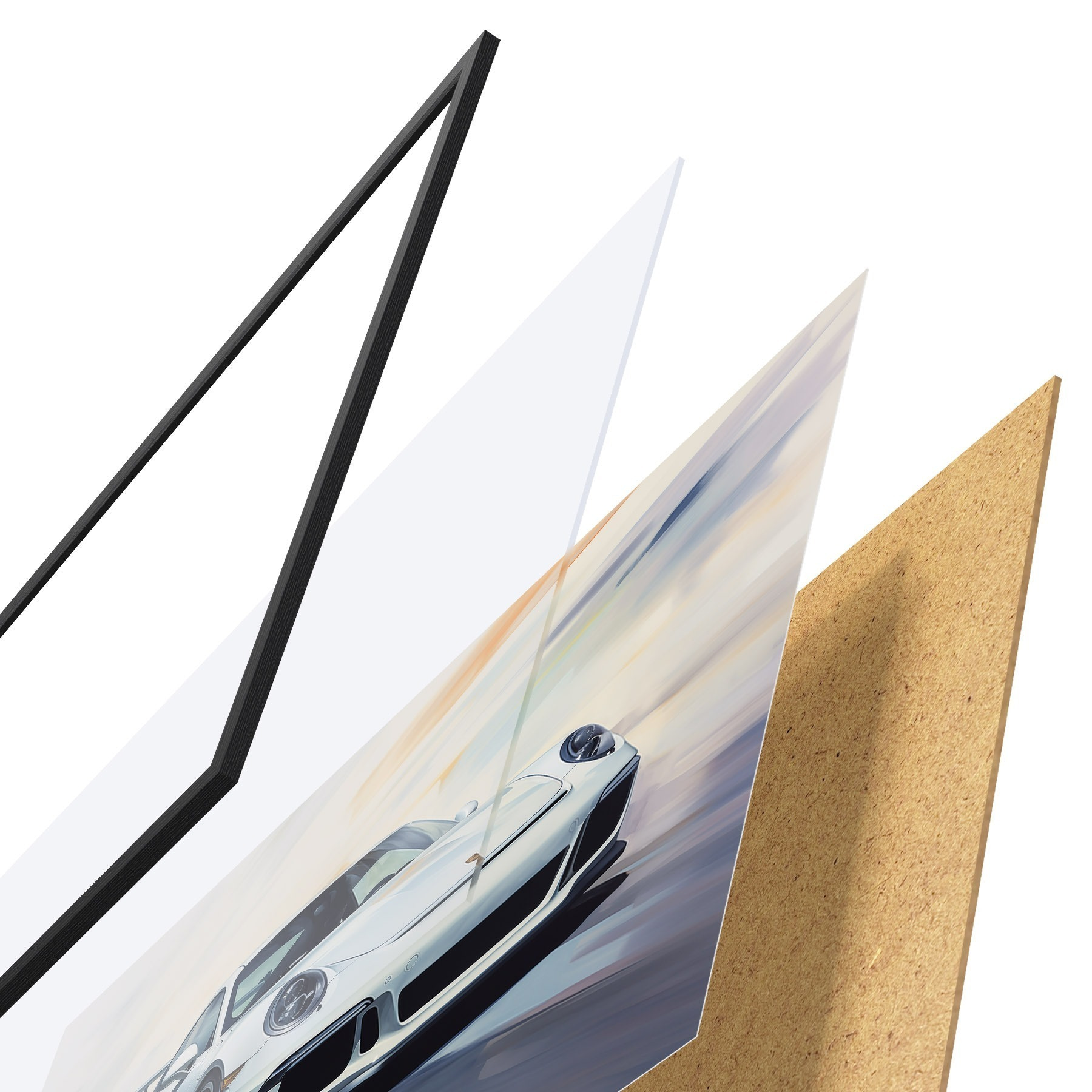 Постер складається з рами, оргскла, надрукованого зображення та підкладки з ДСП. Завдяки кріпленням на звороті плакат можна одразу ж повісити на стіну.