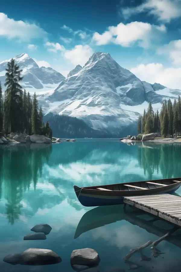 Постер на стіну Альпійське озеро з каное і засніженими вершинами Nr f46481