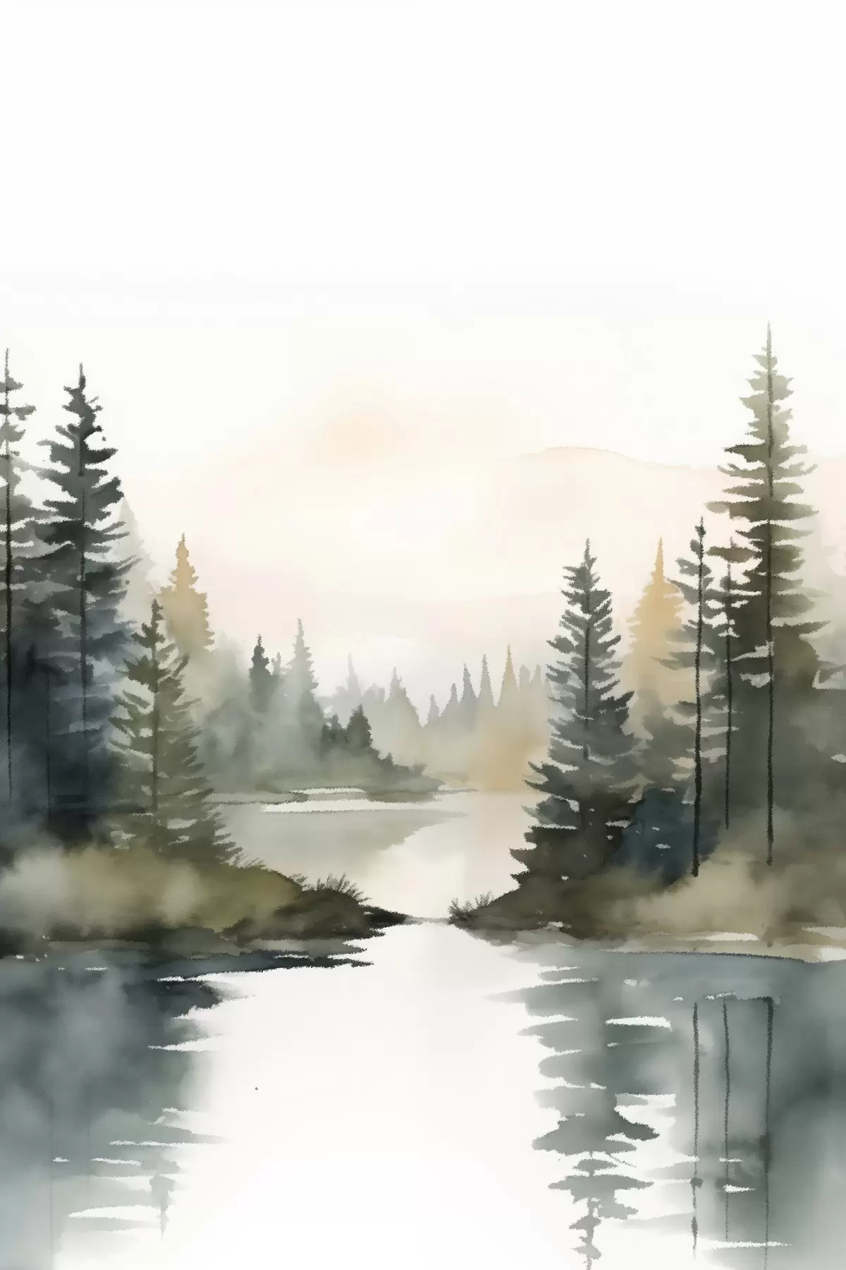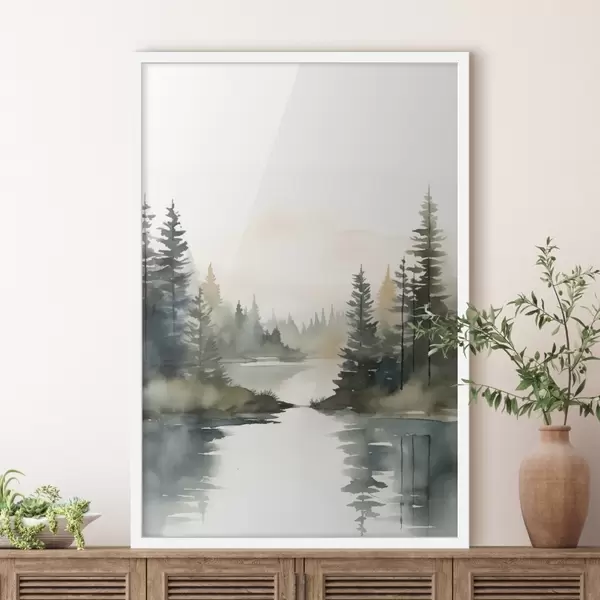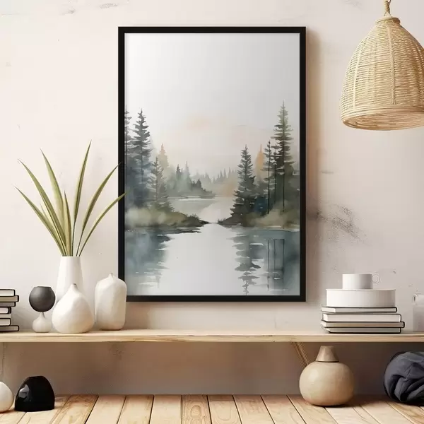 Постер на стіну Туманний хвойний ліс над спокійною річкою, акварельний стиль Nr f46507