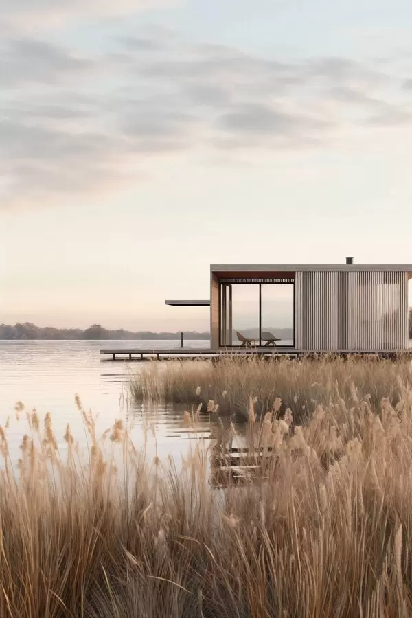 Постер на стіну Сучасна хатина на березі озера серед очерету в м'якому сутінку Nr f46513