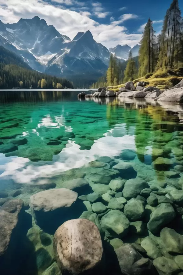 Постер на стіну Смарагдове альпійське озеро з скелями під ним і високими вершинами Nr f46515