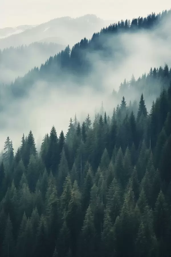 Постер на стіну Туман над хвойними схилами, глибокі зелені тони Nr f46516