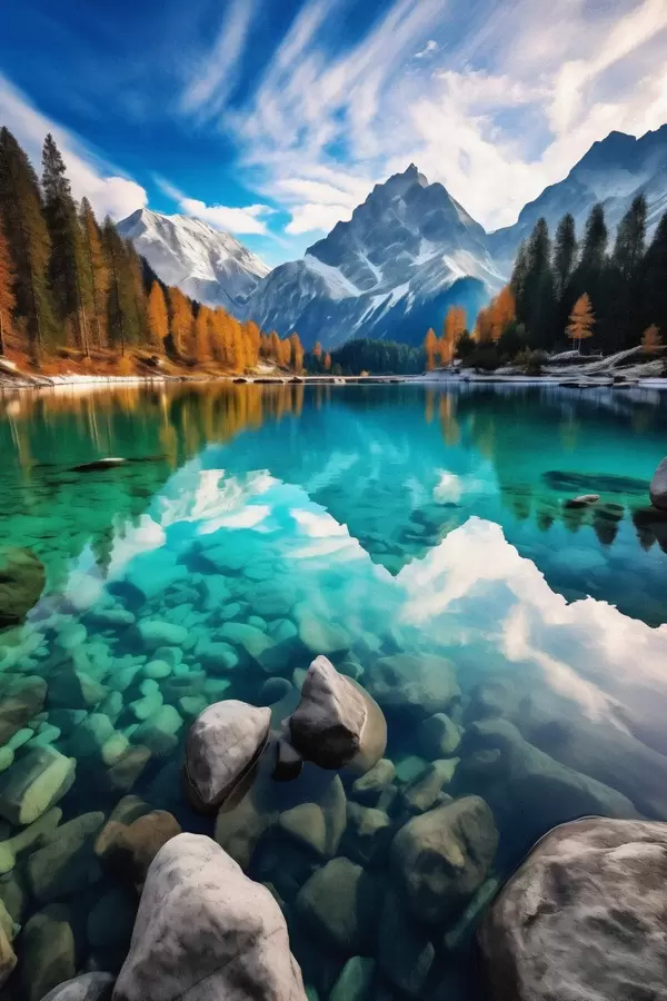 Постер на стіну Гірське озеро з бірюзовою водою та осінніми модринами Nr f46517