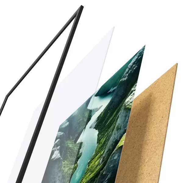 Постер складається з рами, оргскла, надрукованого зображення та підкладки з ДСП. Завдяки кріпленням на звороті плакат можна одразу ж повісити на стіну.