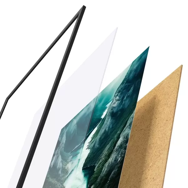 Постер складається з рами, оргскла, надрукованого зображення та підкладки з ДСП. Завдяки кріпленням на звороті плакат можна одразу ж повісити на стіну.