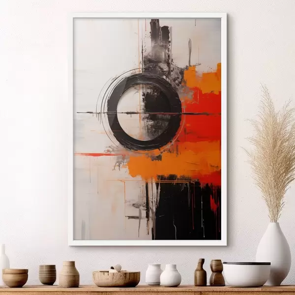 Постер на стіну Чорне коло на білому тлі, помаранчеві штрихи та бризки Nr f46549