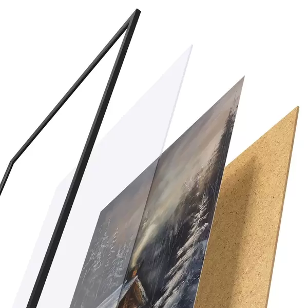 Постер складається з рами, оргскла, надрукованого зображення та підкладки з ДСП. Завдяки кріпленням на звороті плакат можна одразу ж повісити на стіну.