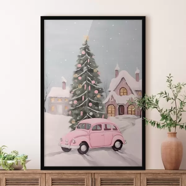 Постер на стіну Рожевий автомобіль і прикрашена ялинка біля будинку Nr f46621