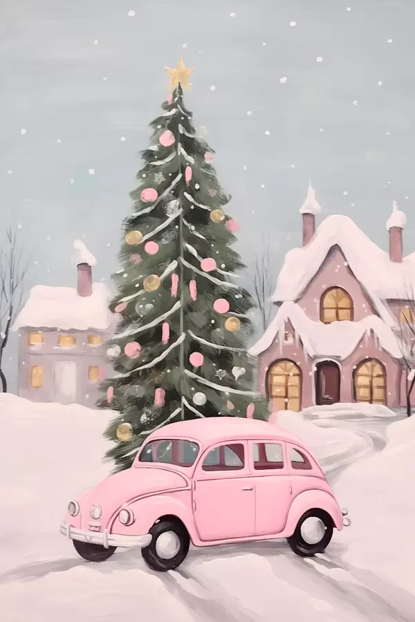 Постер на стіну Рожевий автомобіль і прикрашена ялинка біля будинку Nr f46621