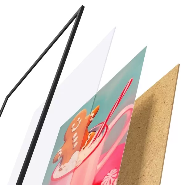 Постер складається з рами, оргскла, надрукованого зображення та підкладки з ДСП. Завдяки кріпленням на звороті плакат можна одразу ж повісити на стіну.