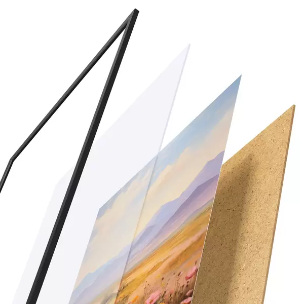 Постер складається з рами, оргскла, надрукованого зображення та підкладки з ДСП. Завдяки кріпленням на звороті плакат можна одразу ж повісити на стіну.