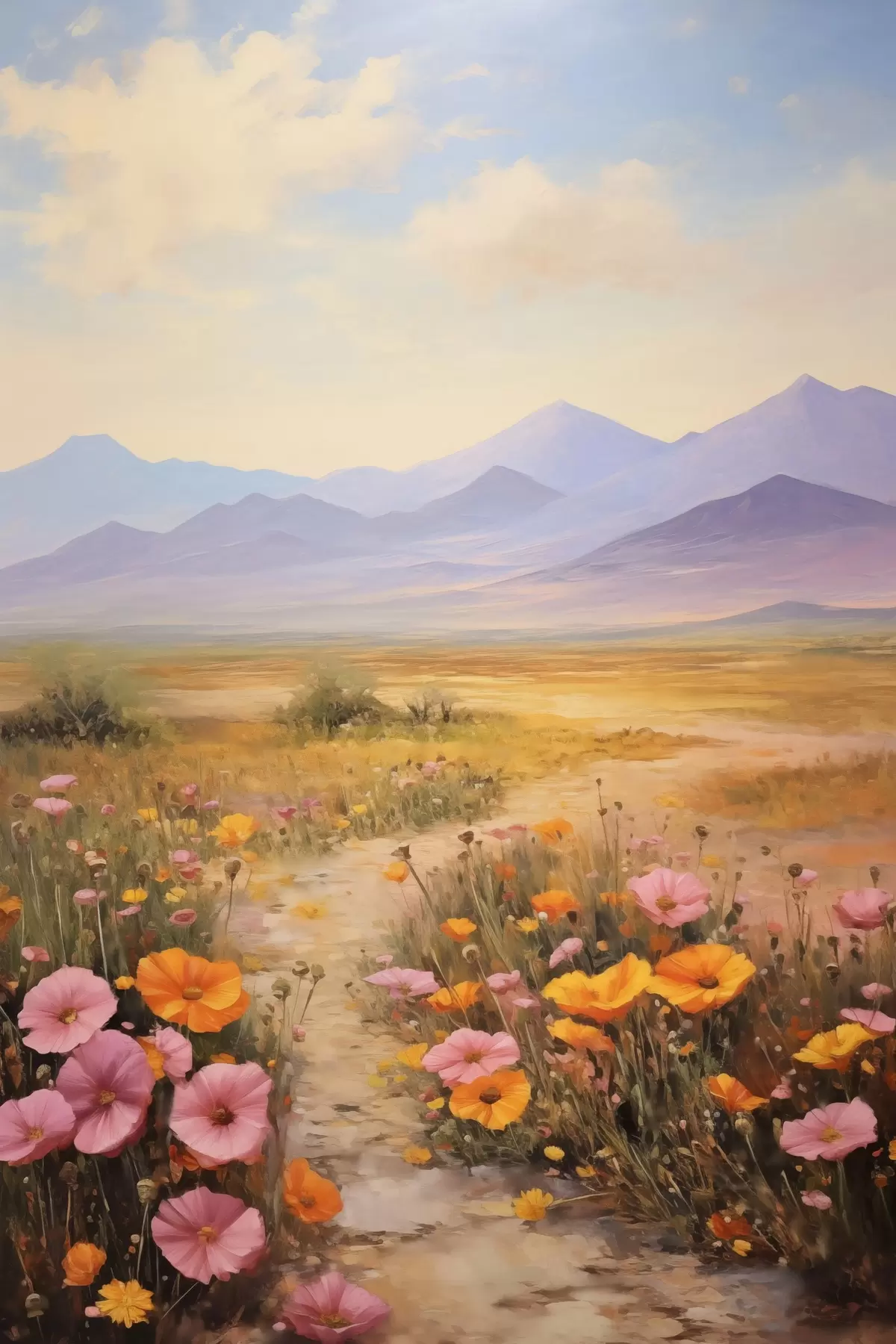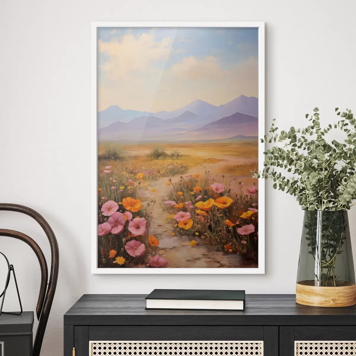 Постер на стіну Пейзаж, поле з барвистими квітами на тлі гір, м'які пастельні кольори Nr f46686