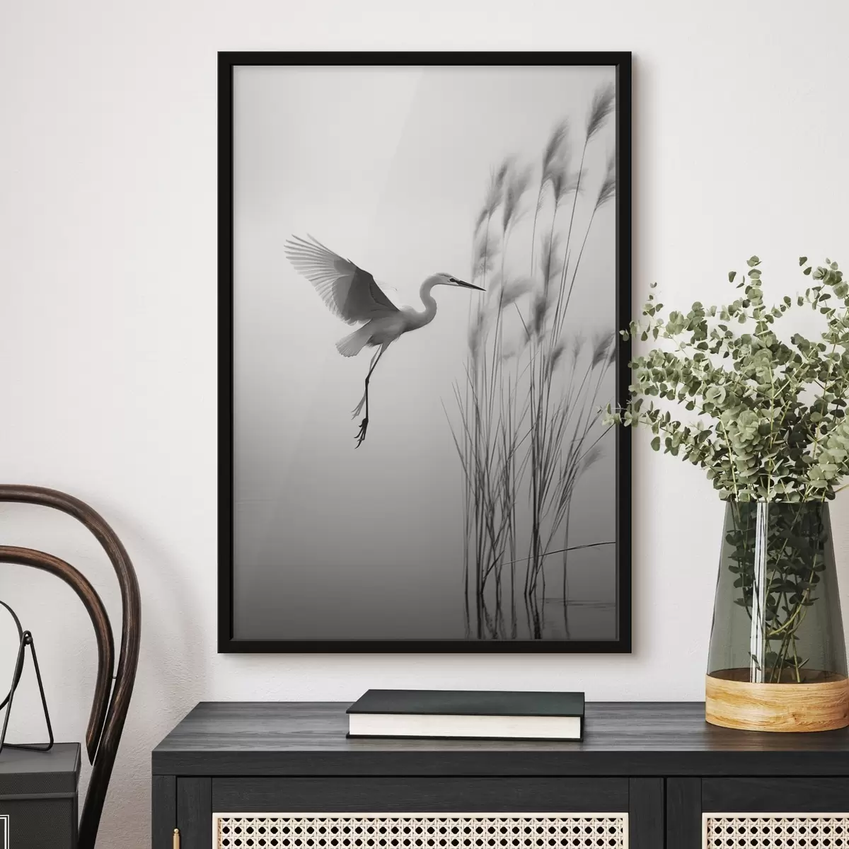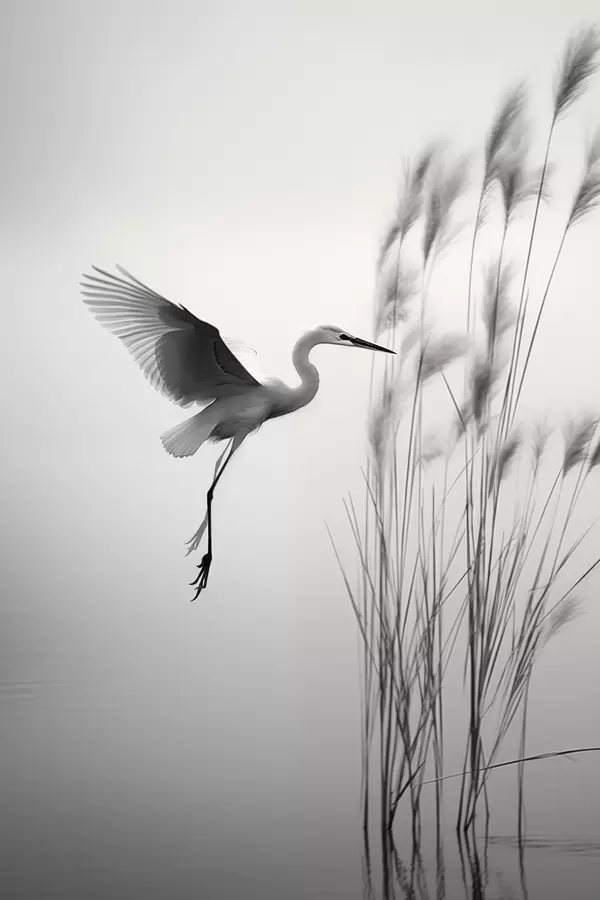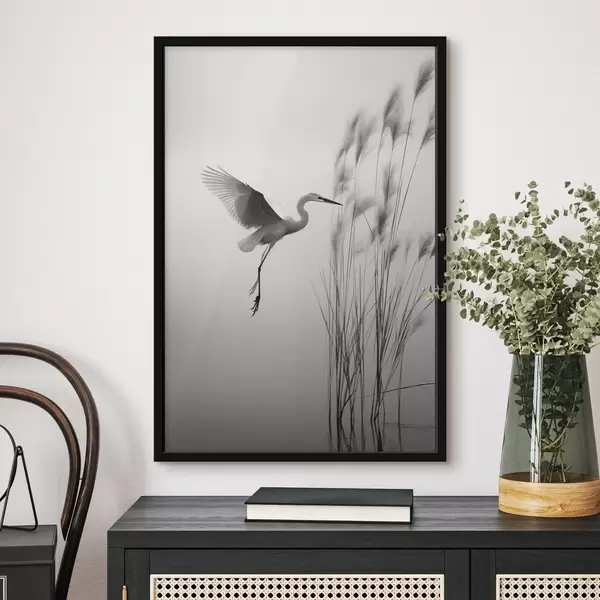 Постер на стіну Біла чапля з розпростертими крилами, що летить біля високих очеретів, чорно-біла мінімалістична композиція Nr f46693