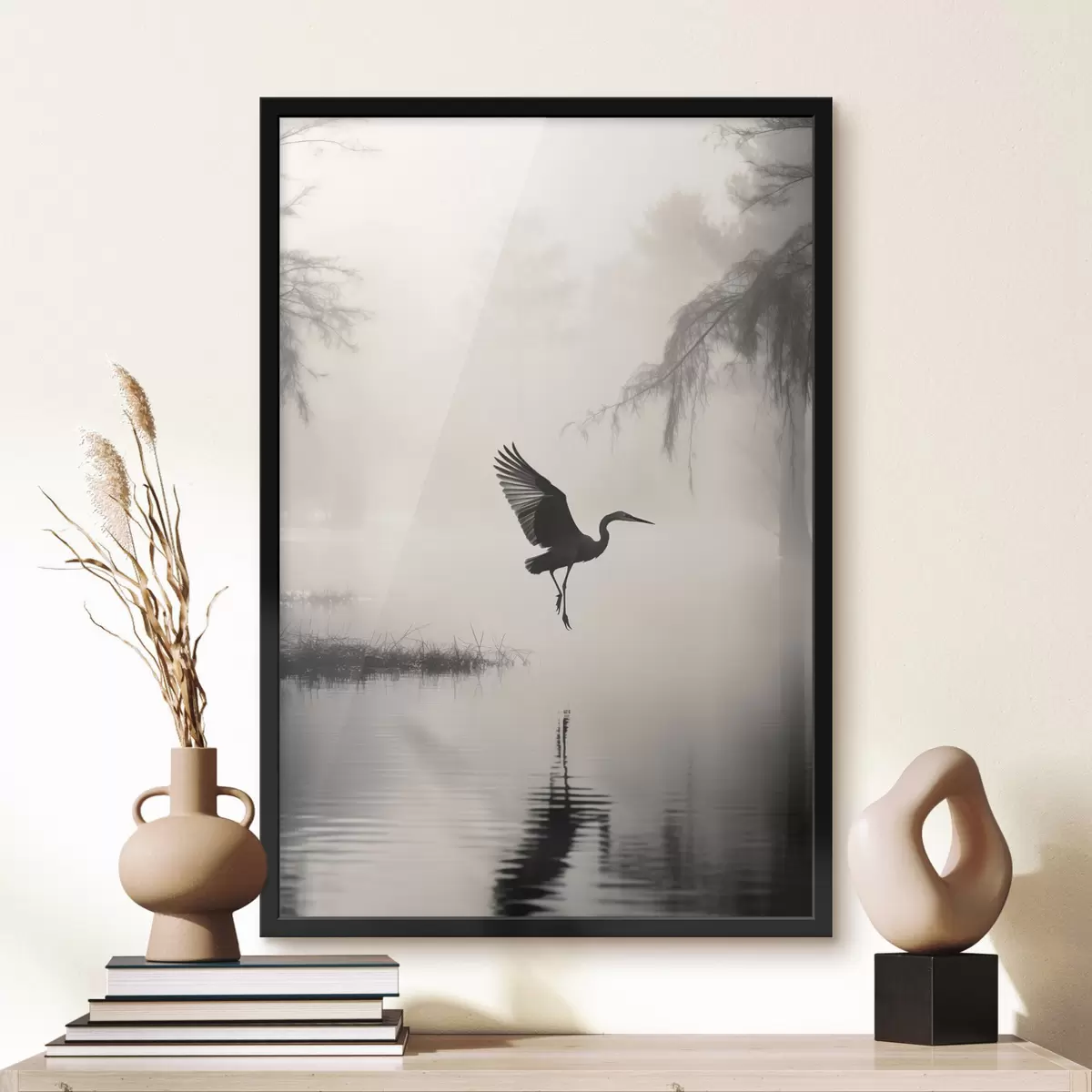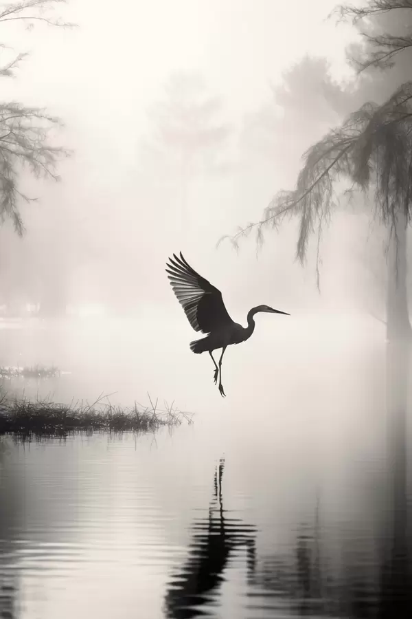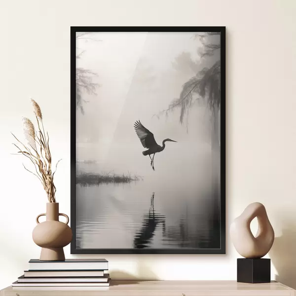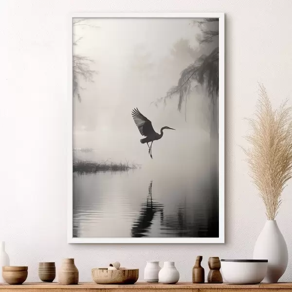 Постер на стіну Біла чапля з розпростертими крилами, що летить біля високих очеретів, чорно-біла мінімалістична композиція Nr f46694